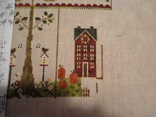 I am making progress on the middle section of this project. I did change the bird's peak to Whiskey as the color as I thought yellow was better than the brown the chart called for. I believe this is a mistake on the chart. I might also mention that I changed out the fabric to a linen rather than the Weeks Dye Works fabric. I always have trouble with that fabric and feel it is too loose. I like this fabric better.